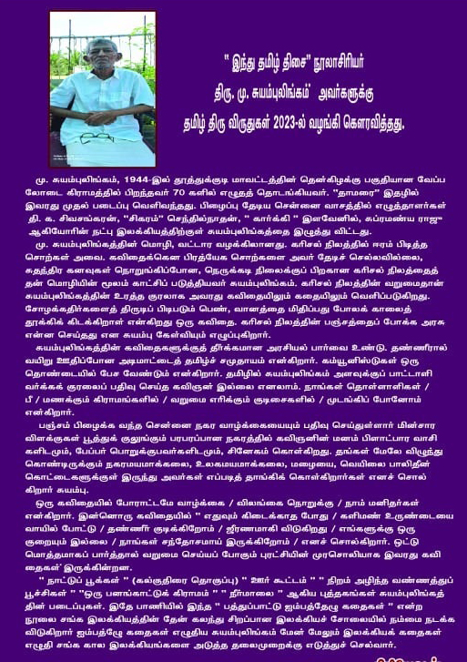 தமிழ் இந்து இதழின் யாதும் ஊரே நிகழ்வில் தமிழ்திரு 2023 விருதினைப் பெற்றார்.